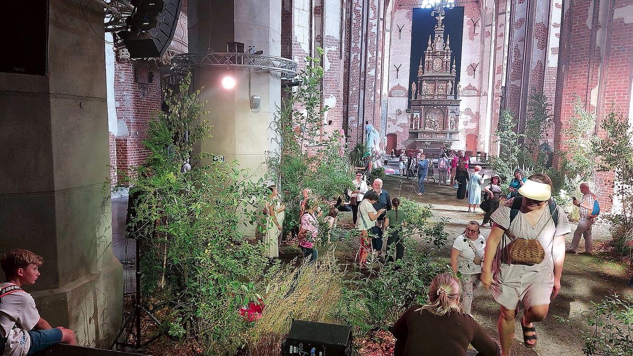 Między 27 czerwca a 5 lipca wnętrze XIV-wiecznego kościoła było się czymś, czego nikt się nie spodziewał – lasem. Nie metaforycznym, nie symbolicznym, ale prawdziwym, z drzewami, mchem, trawą i zapachem mokrej ziemi. Instalacja „LeŚnia” nie tylko przyciągnęła tłumy – stała się zjawiskiem, o którym mówiono, które się przeżywało i które trudno było opisać jednym słowem. Wejście do świątyni poprzedzało często długie oczekiwanie w kolejce. Ale już po przekroczeniu progu wszystko się zmieniało. Posadzka wyłożona trawą, żywe rośliny rozrastające się między filarami, ściany z surowej cegły i – ponad tym wszystkim – złocony, barokowy ołtarz Abrahama van den Blocka. Kontrast bujnej zieleni z monumentalnością gotyckiego wnętrza działał oszałamiająco. Przestrzeń sakralna nabrała nowego znaczenia – stała się miejscem wytchnienia, zanurzenia, doświadczenia.