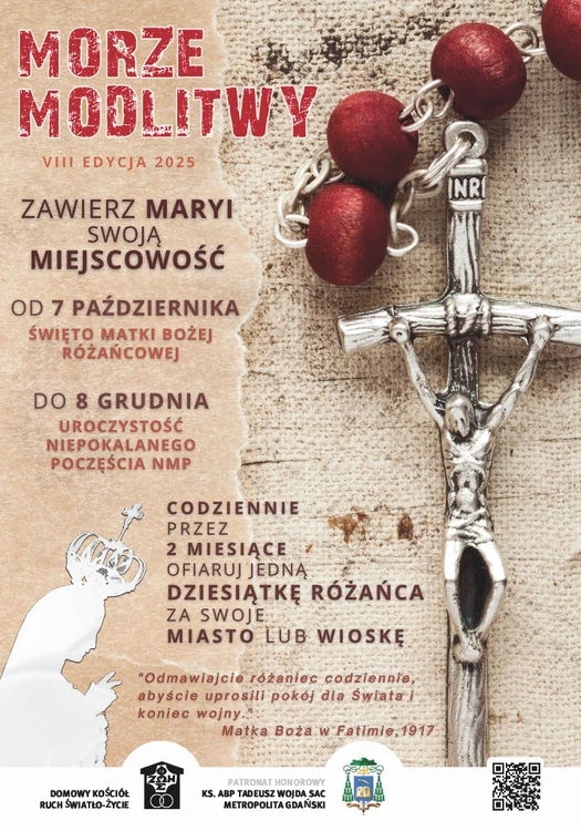 Morze Modlitwy to nie kampania. To codzienna, cicha walka o sąsiadów, rodziny, przyjaciół i tych, którzy nie mają już siły się modlić. Od święta Matki Bożej Różańcowej, 7 października, aż do uroczystości Niepokalanego Poczęcia NMP, 8 grudnia, uczestnicy inicjatywy codziennie odmawiają dziesiątkę różańca i specjalną modlitwę - tekst znajduje się na ulotkach, dostępnych we wszystkich parafiach archidiecezji.